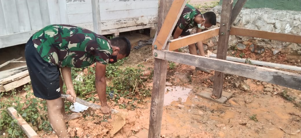 Anggota Koramil 1014 - 07/Balai Riam melanjutkan membangun kelengkapan fasilitas Pos Terpadu di Desa Natai Kondang Kecamatan Permata Kecubung Kab. Sukamara.