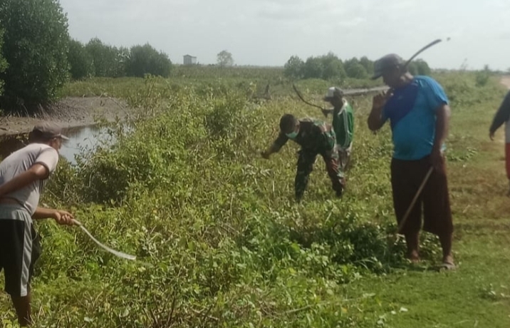 Babinsa Sei Baru Koramil 1014 bersama warga saat membersihkan rumput
