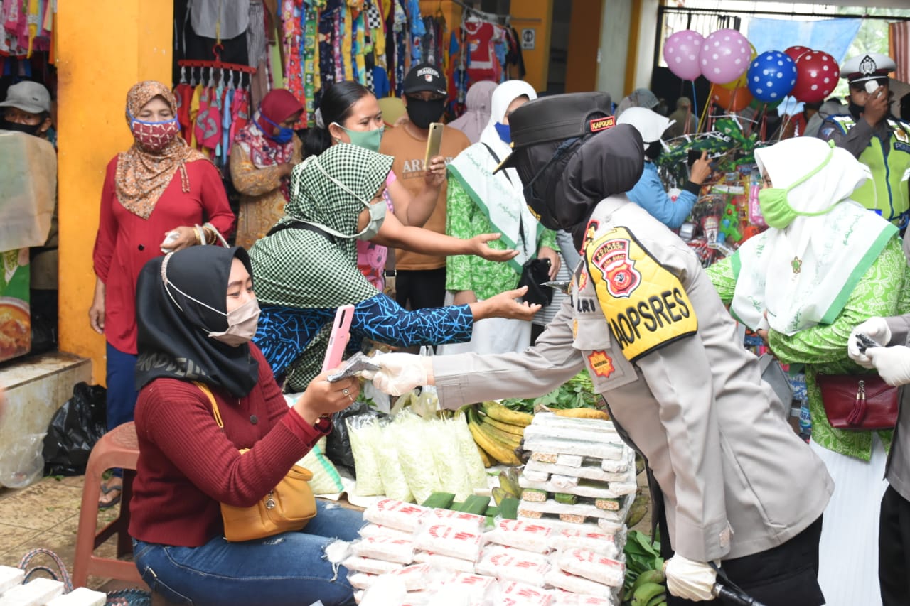Kapolres Banjar didampingi oleh pengurus dan anggota Muslimat Nahdlatul Ulama (NU) Kota Banjar dan personil Polwan Polres Banjar membagikan masker di pasar Langensari