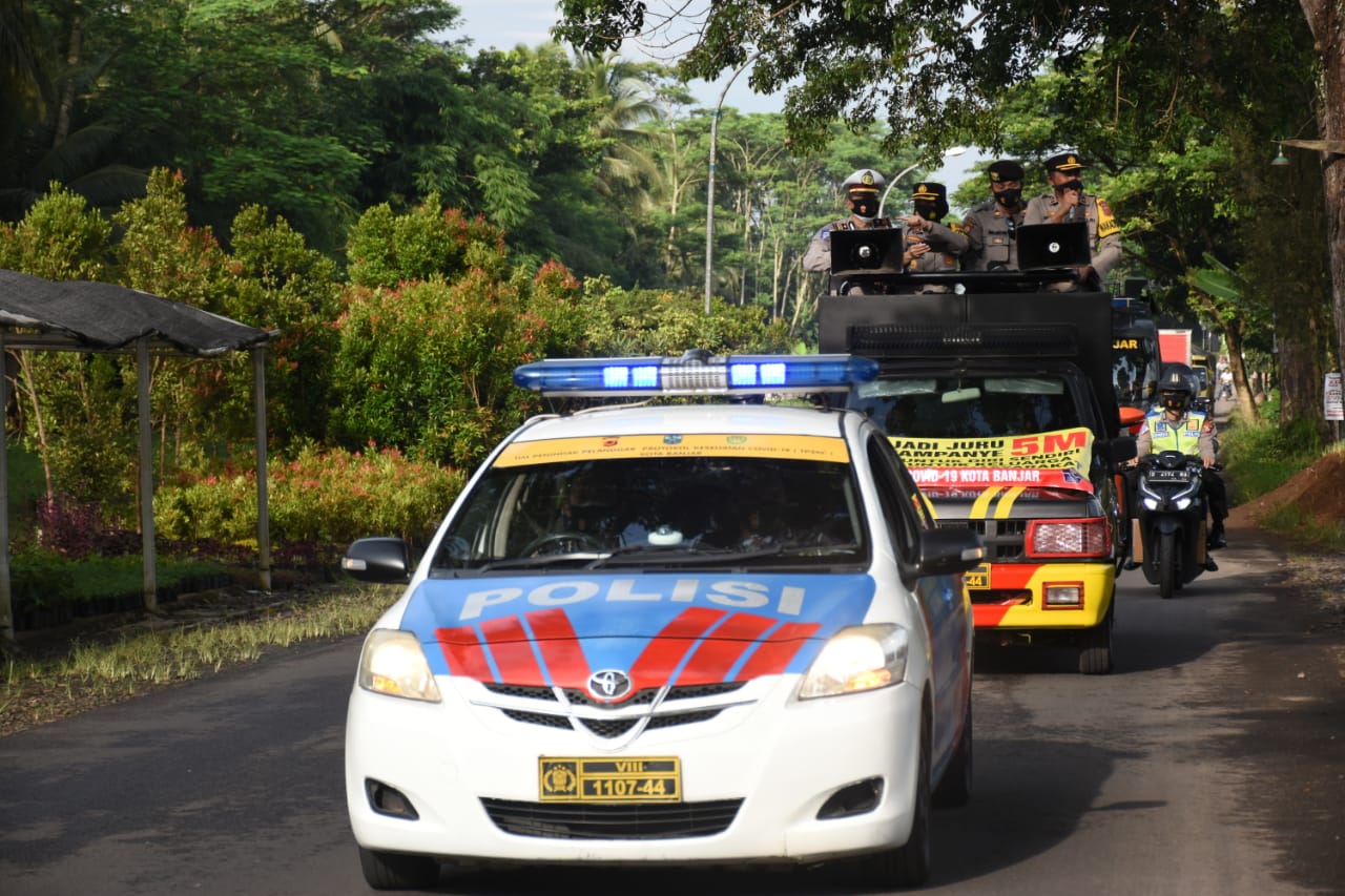 Secara bergantian Kapolres Banjar dan Pamen Asistensi Polda Jabar sampaikan imbauan protokol kesehatan dengan menggunakan pengerah suara di kendaraan Public Addres tersebut.
