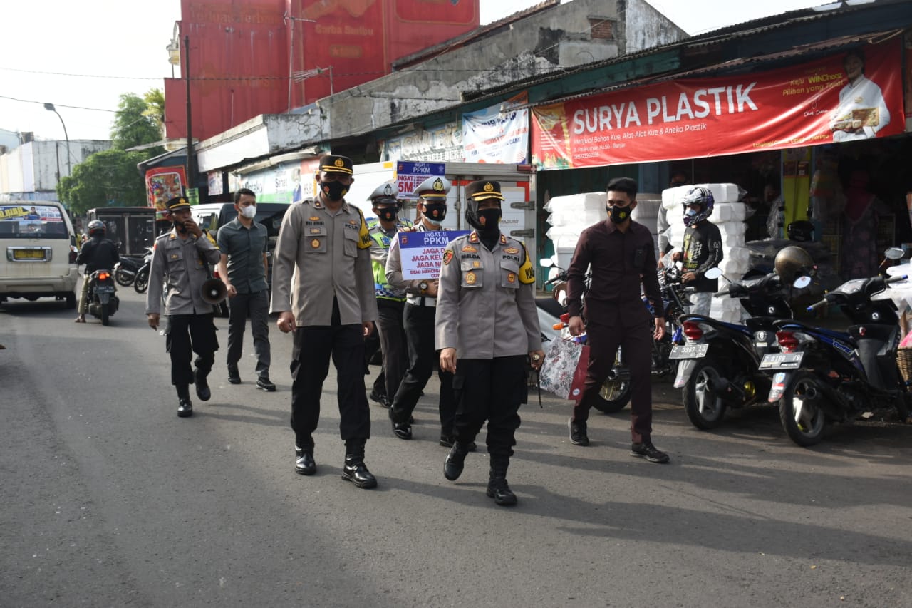 Kapolres Banjar AKBP Melda Yanny, S.I.K.,M.H. bersama Wakapolres Banjar, Kasat Binmas, Kasat Lantas, Para Perwira dan Personel Polres Banjar dengan berjalan kaki sampaikan himbauan protokol kesehatan. (1/2)