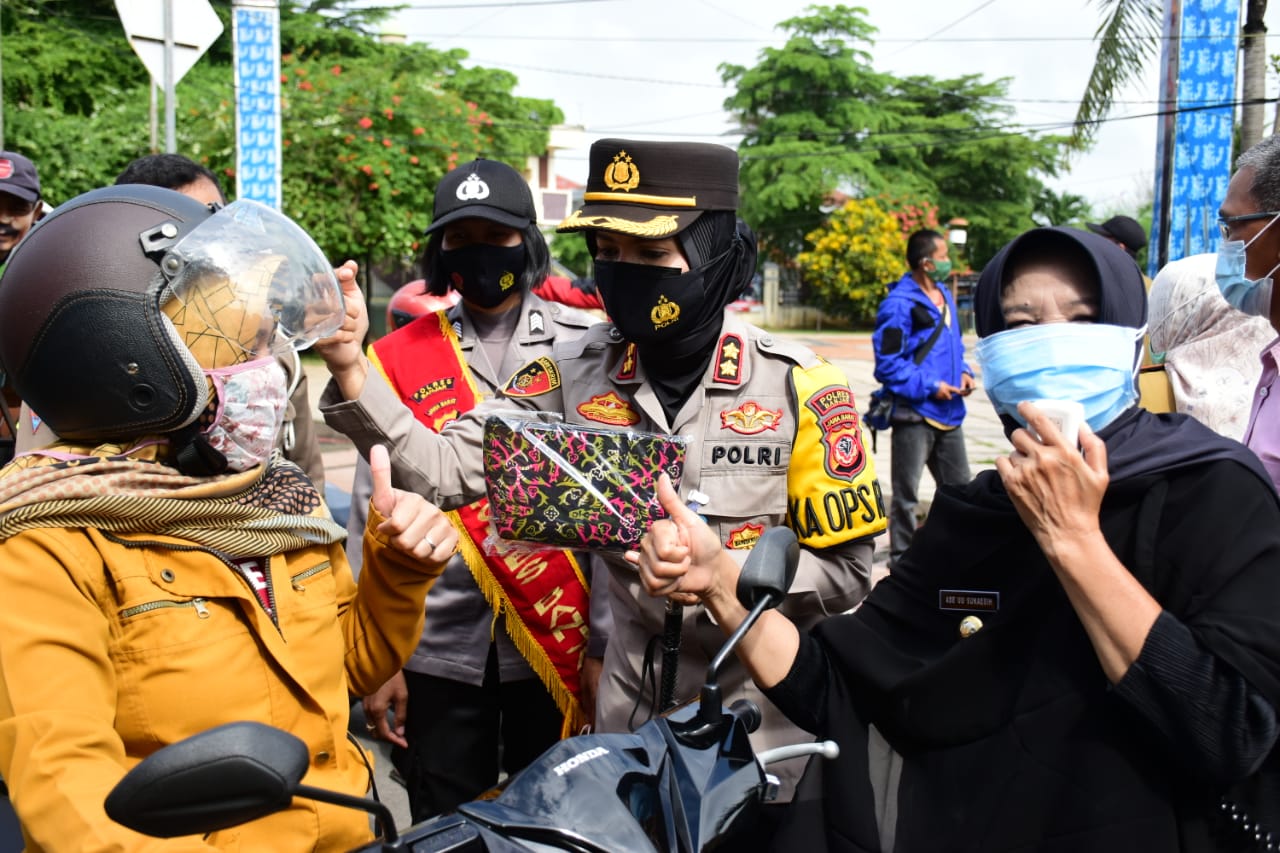 Aksi simpatik tersebut berupa membagikan masker, face shield, hand sanitizer, dan coklat terhadap pengendara khususnya kaum perempuan.