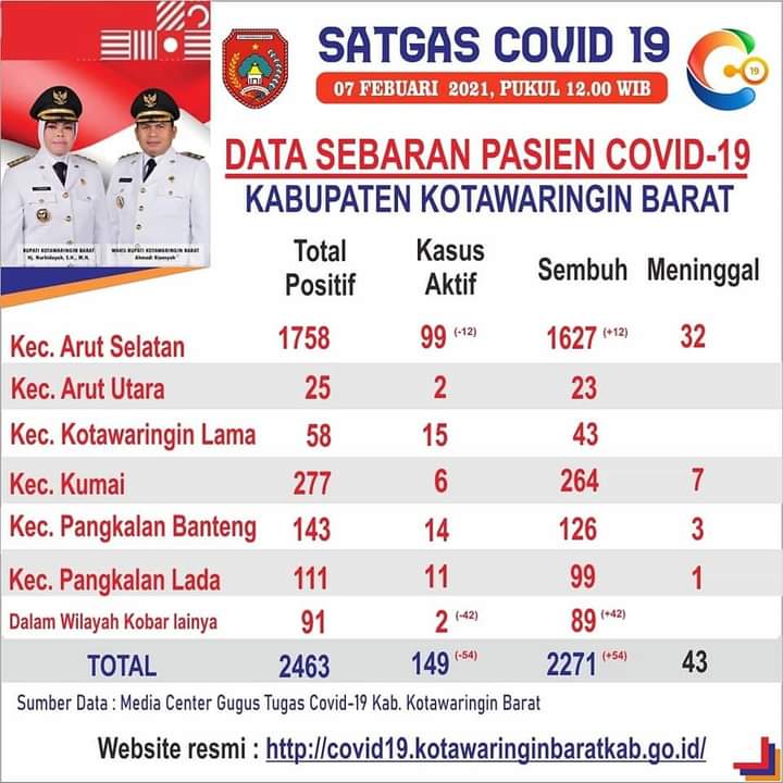 Berdasarkan data yang dihimpun sejak Minggu (7/2/2021) tersebut, diketahui pasien sembuh di setiap Kecamatan, Kecamatan Arsel sembuh Covid-19 berjumlah 1627, Arut Utara 23, Kotawaringin Lama 43, Kumai 264, Pangkalan Banteng 126, Pangkalan Lada 99, dan wilayah Kobar lainya 89, total sembuh Covid-19 berjumlah 2271.