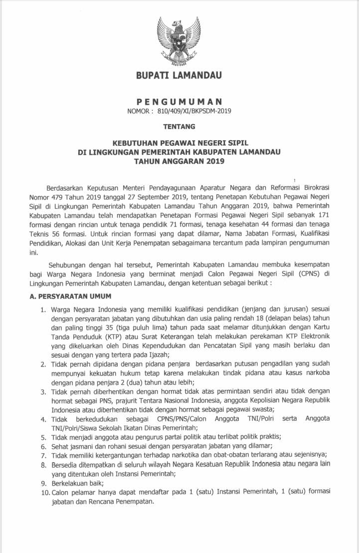 Headline Lamandau Pengumuman Penerimaan CPNS di Kabupaten Lamandau 2019 kotawaringinnews.co.id 13 November 2019 Screenshoot lembar halaman depan pengumuman penerimaan CPNS di Kabupaten Lamandau 2019. INFORMASI LEBIH LANJUT KUNJUNGI LAMAN :http://www.lamandaukab.go.idContinue ReadingPrevious: Pemutakhiran Data Pemilih Pilkada Kalteng Mulai Dilakukan Maret 2020Next: PT SAL Diduga ‘Tutup Mata’ Terhadap Karyawannya yang Alami Kecelakaan Kerja Related Stories Headline Seruyan Ribuan Warga Padati Tenis Indoor Pemkab Seruyan kotawaringinnews.co.id 21 April 2026 Headline Kotawaringin Timur Seruyan PN Sampit Dimosi Tidak Percaya Ratusan Anggota KSU-SB Sembuluh II kotawaringinnews.co.id 20 April 2026 Headline Kotawaringin Barat Kejari Kobar Bantah Isu Permintaan Uang Oknum Jaksa kotawaringinnews.co.id 18 April 2026
