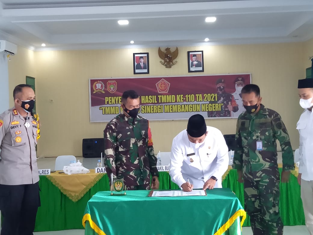 Kotawaringin News, Kotawaringin Barat – Wakil Bupati Kotawaringin Barat (Kobar) Ahmadi Riansyah menghadiri kegiatan penandatanganan naskah penyerahan hasil pekerjaan, sekaligus menutup kegiatan TNI Manunggal Membangun Desa (TMMD) Imbangan ke-110 Kodim 1014/Pbn TA. 2021, Rabu 31 Maret 2021, di Aula Palapa Kodim 1014/Pbn.